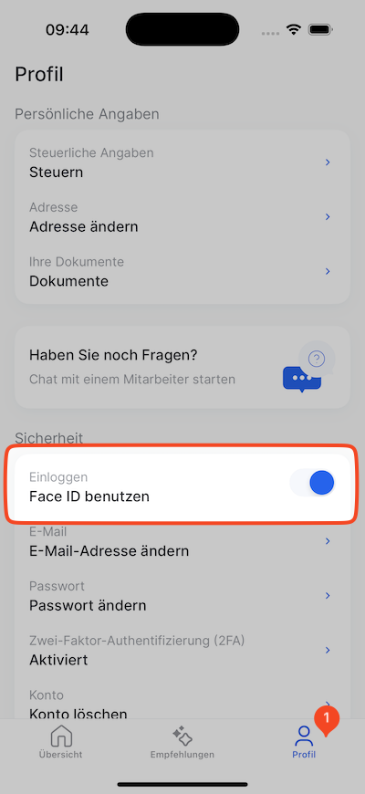 You can enable or disable the Face ID feature within our app under “Profile” → “Security” → “Use Face ID”. If you don't see this option, it might be because the app doesn't have the required permissions. In that case, you can easily update this in your device settings.